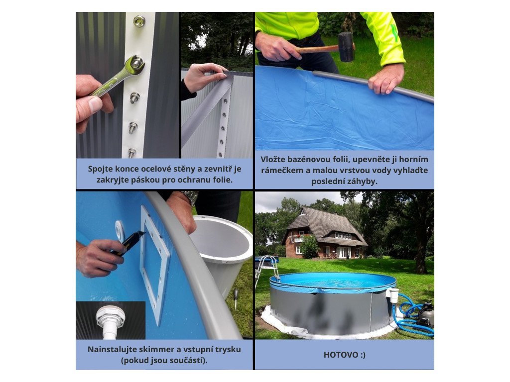 Bazén se instaluje pomocí spodních a horních lišt, do kterých se zasazuje ocelová stěna. Oba kraje stěny se propojí pomocí vnitřních a vnějších lišt a šroubů. Mrazuvzdorná folie se pomocí zalomení o horní část ocelové stěny zavěsí a vytvaruje do bazénu dle vizuálních požadavků. Folie je flexibilní a na míru vyrobena pro tento typ bazénu (není třeba žádných úprav). Pro montáž krok za krokem následujte pokyny v montážním návodu.