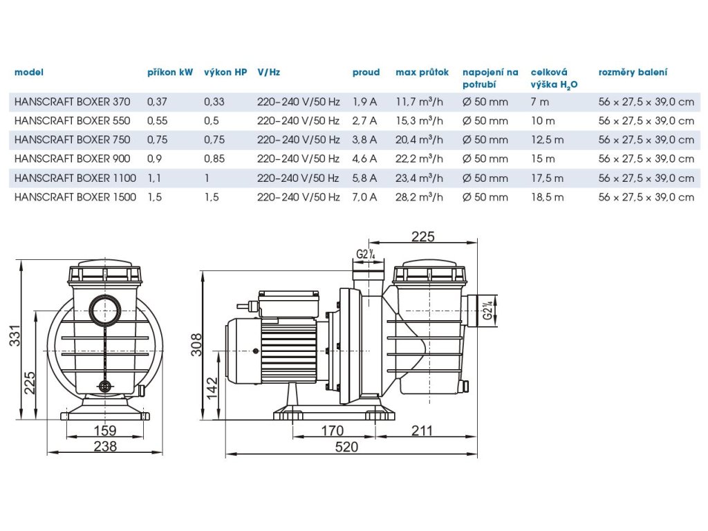 Bazénové čerpadlo Boxer 550 má výkon 12 m3 za hodinu. Je určeno pro pískovou filtraci pro slanou i sladkou vodu. Čerpadlo je samonasávací při výšce osazení do 2,5 m nad vodní hladinu. Má pojistku proti přepětí. Je vhodné pro filtrování venkovních i vnitřních bazénu do 60 m3 s vestavěným nebo závěsným skimmerem. Celkový rozměr je 520 x 238 x 331 mm.