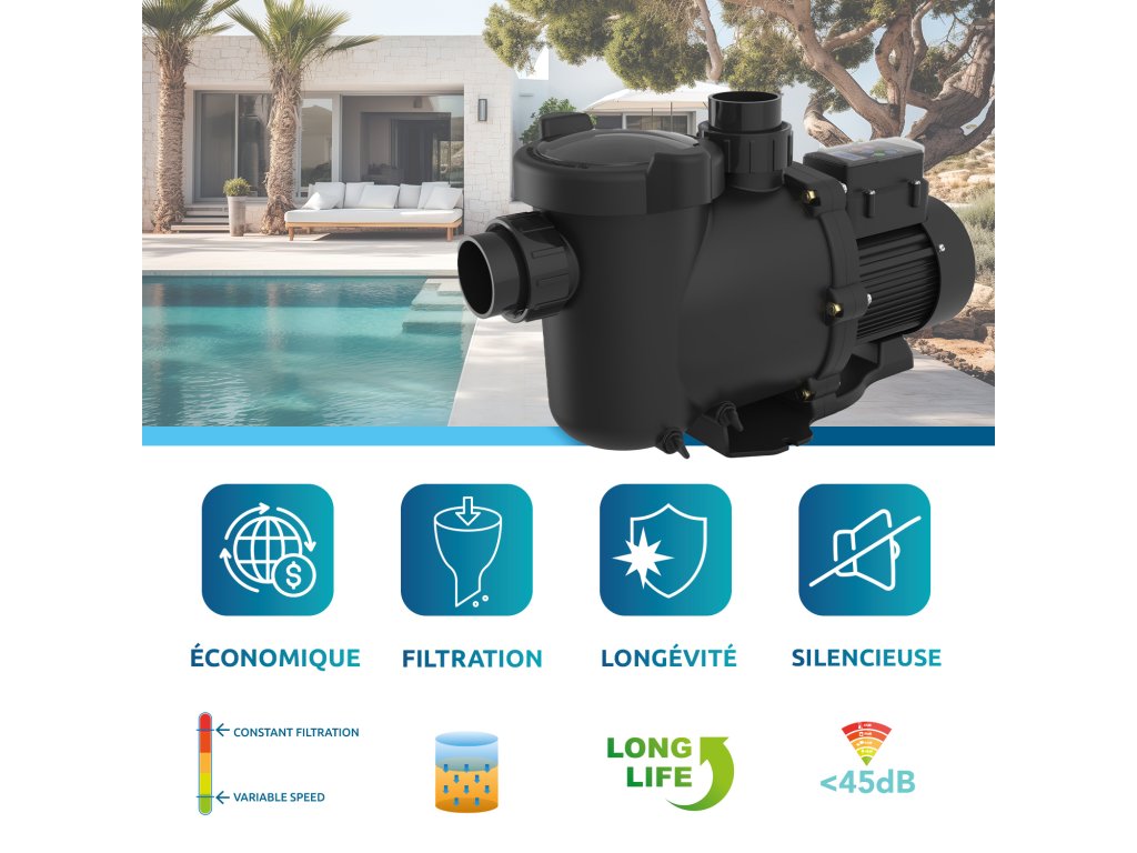 Díky snížené hladině hluku ( méně než 45 dB při nízkých otáčkách) zaručuje klidný zážitek z koupání a zároveň udržuje stálou a vylepšenou filtraci .