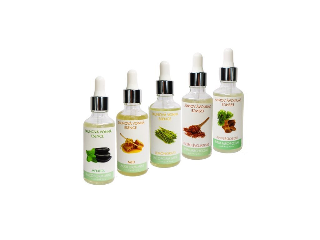 Set Lacoform Mini obsahuje 3 základní a 2 zesilující esence. Je primárně určen pro domácí použití. Praktická malá balení s kapátky umožňují dávkování esence do saunové naběračky a měnit vůně během saunování. Základní esence jsou Lemongras, Kosodřevina a Santalové dřevo. S přidáním zesilovací esence Med můžete dodat základním vůním sladký, těžký nádech. S přidáním zesilovací esence Mentol můžete naopak základní esenci odlehčit a doplnit ji o lehké, větrové tóny.