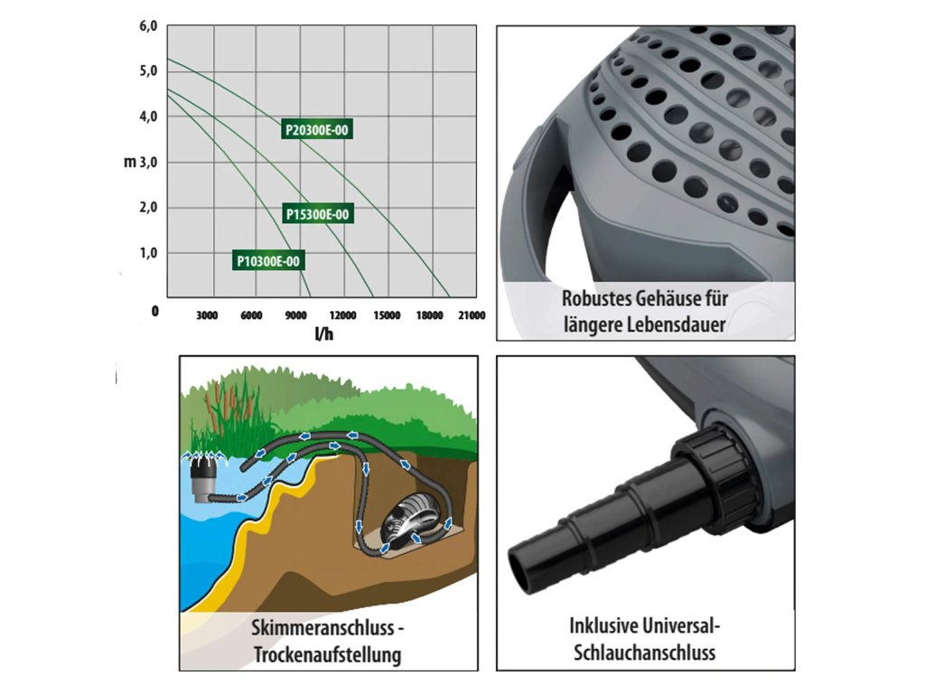 Výkon čerpadla si můžete přizpůsobit podle potřeby jezírka, například zvyšte výkon pro filtraci v létě, snižte výkon na jaře a na podzim. Upravte si přísun kyslíku do Vašeho jezírka dodávaný vodopádem, na časovači nastavte přes den výkon 50 %, přes noc 10 %. V případě potřeby si individuálně nastavte výkon pro vodní hry. Díky regulaci výkonu a spotřeby ušetříte za energie. Robustní tělo zajišťuje dlouhou životnost jezírkového čerpadla a umožňuje průchod nečistot až do průměru 10 mm. čerpadlo lze uložit jak ve vodě Hadicová přípojka má 3 úrovně, takže lze připojit hadici o průměru 25 – 32 - 38 mm (1" - 1 1/2").