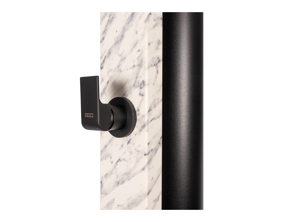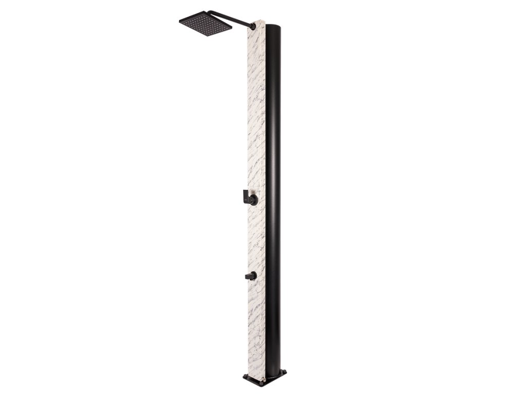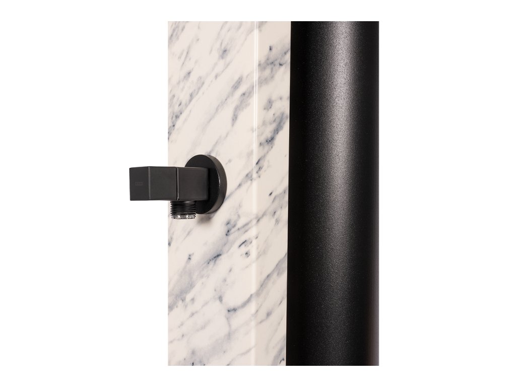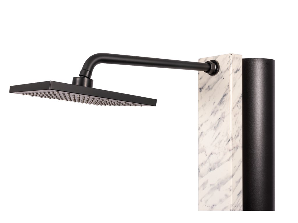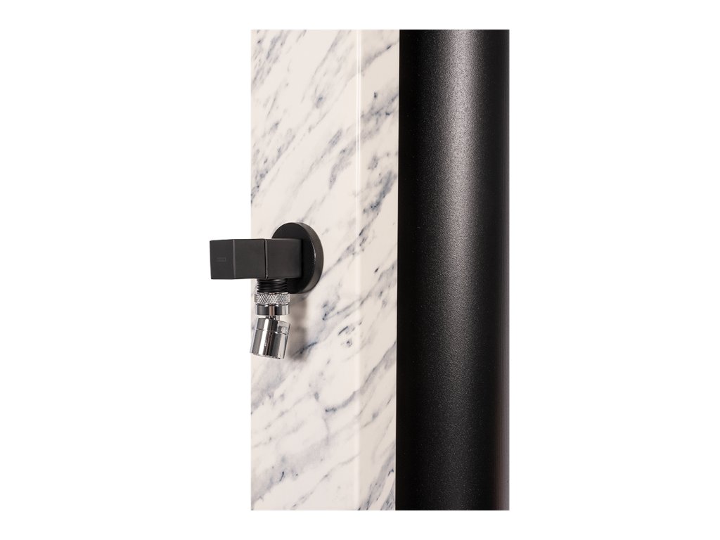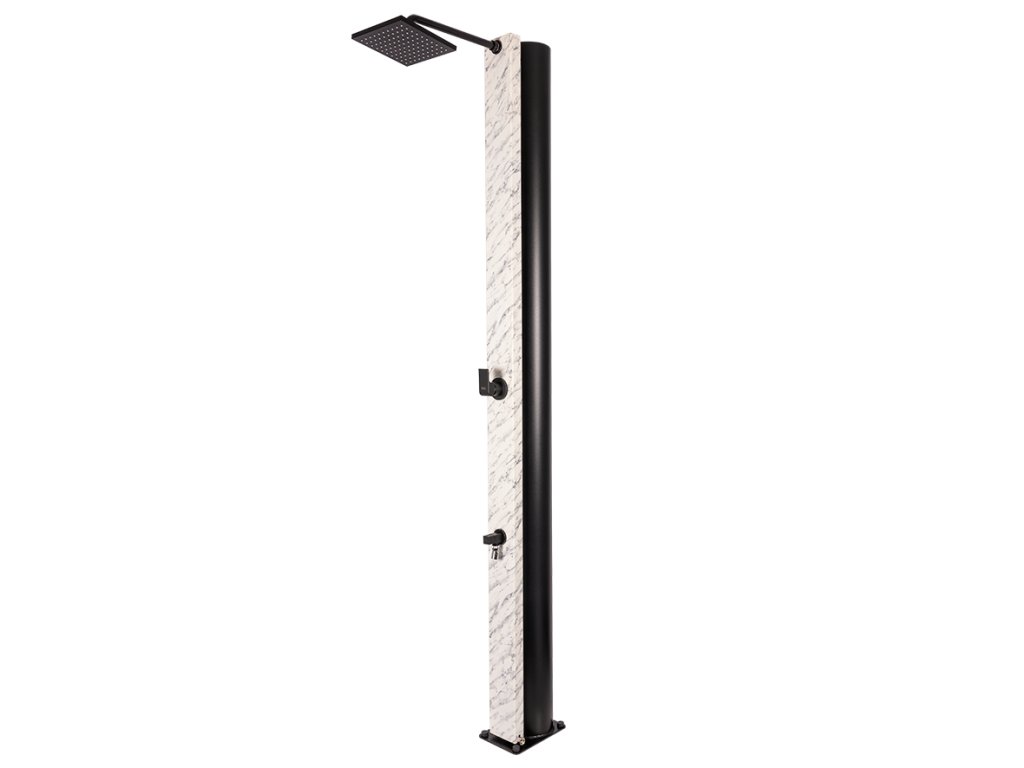 Hliníková solární sprcha s objemem 40 litrů s mramorovou povrchovou úpravou Calacatta Gloss a šířkou 112 mm. Sada obsahuje obdélníkovou mosaznou jednopákovou baterii v matné černé barvě. Má matně černé mosazné rameno (350 mm) na jejímž konci je matně černá sprchová hlavice o velikosti 220 x 200 mm.Tento model je vybaven oplachem nohou.