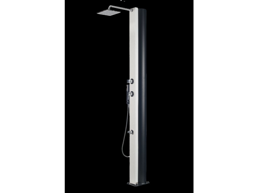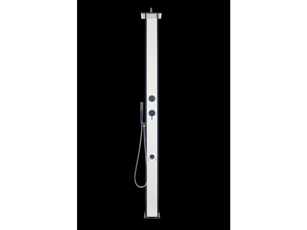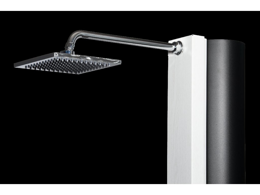 Hliníková solární sprcha o objemu 40 litrů. Přední část je vyrobena z pozinkované oceli s povrchovou úpravou dřeva - bilý dub a šířkou 112 mm. Obsahuje jednopákovou baterii s obdélníkovým designem z pochromované mosazi. Rozměr sprchové hlavice je 200 x 200 mm. Tento model je vybaven sprchou pro oplach nohou.
