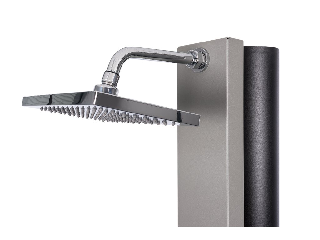 Hliníková solární sprcha s objemem 30 litrů. Přední část široká 112 mm a je z pozinkované oceli. Sada zahrnuje jednopákovou baterii s obdélníkovým designem z pochromované mosazi. Na konci chromovaného ramene (178 mm) je sprchová hlavice o rozměru 220 x 150 mm. Vnitřním přívod vody 1/2″. Součástí tohoto modelu není oplach nohou.