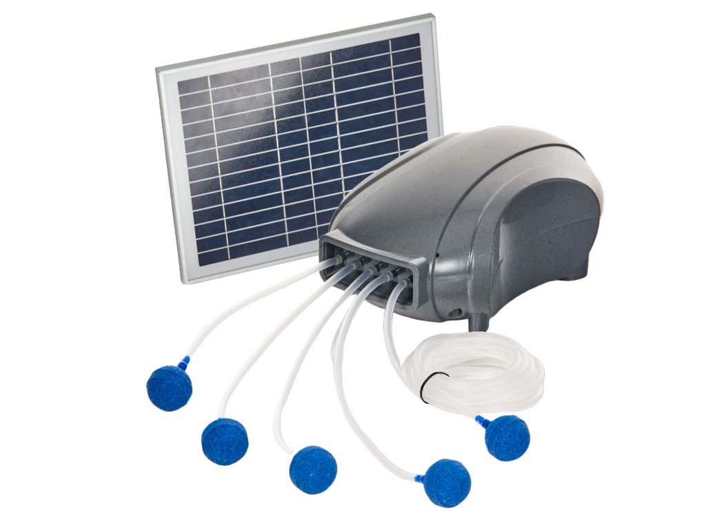 - Obsah balení: vzduchovací jednotka, solární panel, hadice 5x3 m, 5x vzduchovací kámen, kolík na upevnění panelu