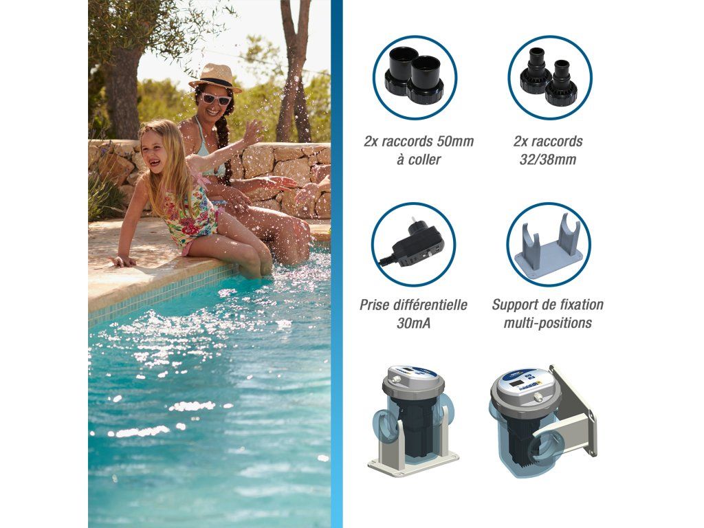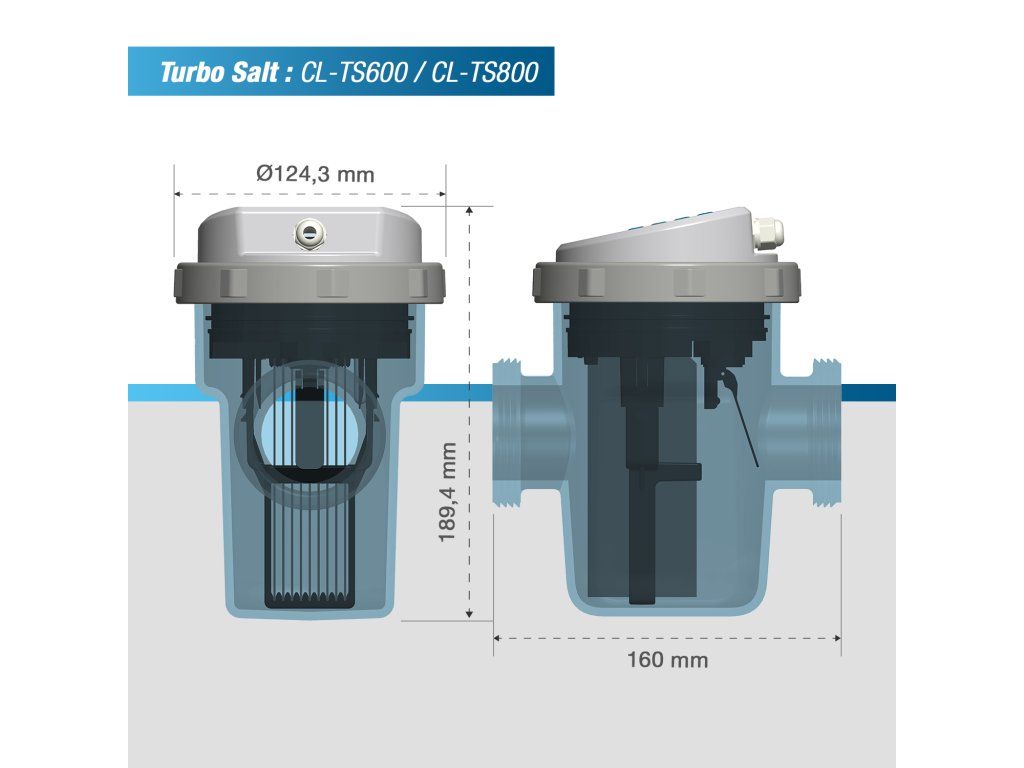 Dostupné pro bazény do 80m3. Turbo Salt je dodáván s připojením 50 mm (1' 1/2) a adaptéry 32/38 mm. Díky jeho upevnění na stěnu nebo podlahu se tento elektrolyzér přizpůsobí všem typům filtrace a jeho ultra-kompaktní velikost umožňuje instalaci i v nejmenších technických místnostech.