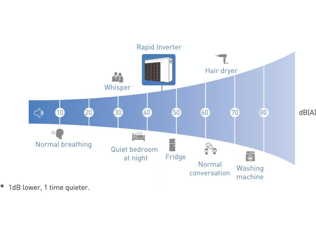 Když Rapid Inverter běží při střední nebo nízké rychlosti pro udržení teploty bazénu, je hlučnost kompresoru extrémně nízká. Rapid Inverter má v závislosti na velikosti bazénu efektivitu COP až 16 (při teplotě vzduchu 26° C, vody 26° C a vlhkosti vzduchu 80 %)