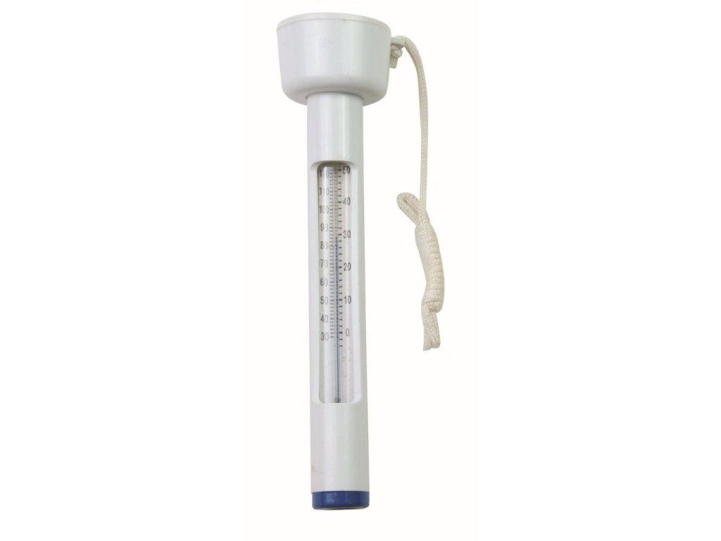 Plovoucí teploměr, slouží k měření teploty bazénové vody, doplněn provázkem k upevnění např. ke schůdkům