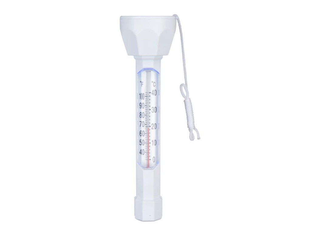 Plovoucí teploměr, slouží k měření teploty bazénové vody, doplněn provázkem k upevnění např. ke schůdkům